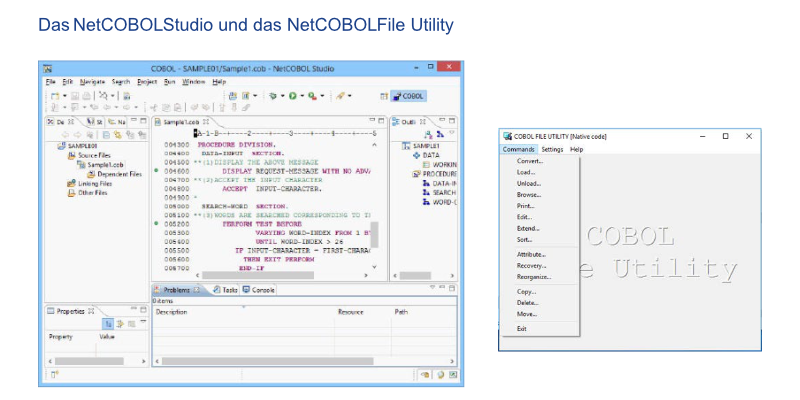 NetCOBOL for Windows x64 wird mit einer integrierten Entwicklungsumgebung geliefert und bietet einen Editor, Compiler, interaktives Debugging und eine ausführbare Umgebung. Zudem bietet es eine Reihe von anderen Programmierwerkzeugen wie einen COBOL-Datendatei-Editor, einen Datenkonverter, PowerFORM, ein Werkzeug zur Erstellung grafischer Druckformulare und PowerBSORT, ein interaktives Batch- und COBOLSortierwerkzeug. Besonders erwähnenswert ist auch das NetCOBOL Studio, eine auf Eclipse basierende Entwicklungsumgebung mit allen Vorzügen der offenen IDE. Mit den Subroutinen zur Unterstützung verschiedener Web-Protokolle sowie der Konnektivität zu einer Reihe von Datenbanken deckt NetCOBOL for Windows x64 die Anforderungen der meisten COBOL Programmierer in einem einzigen Paket ab.